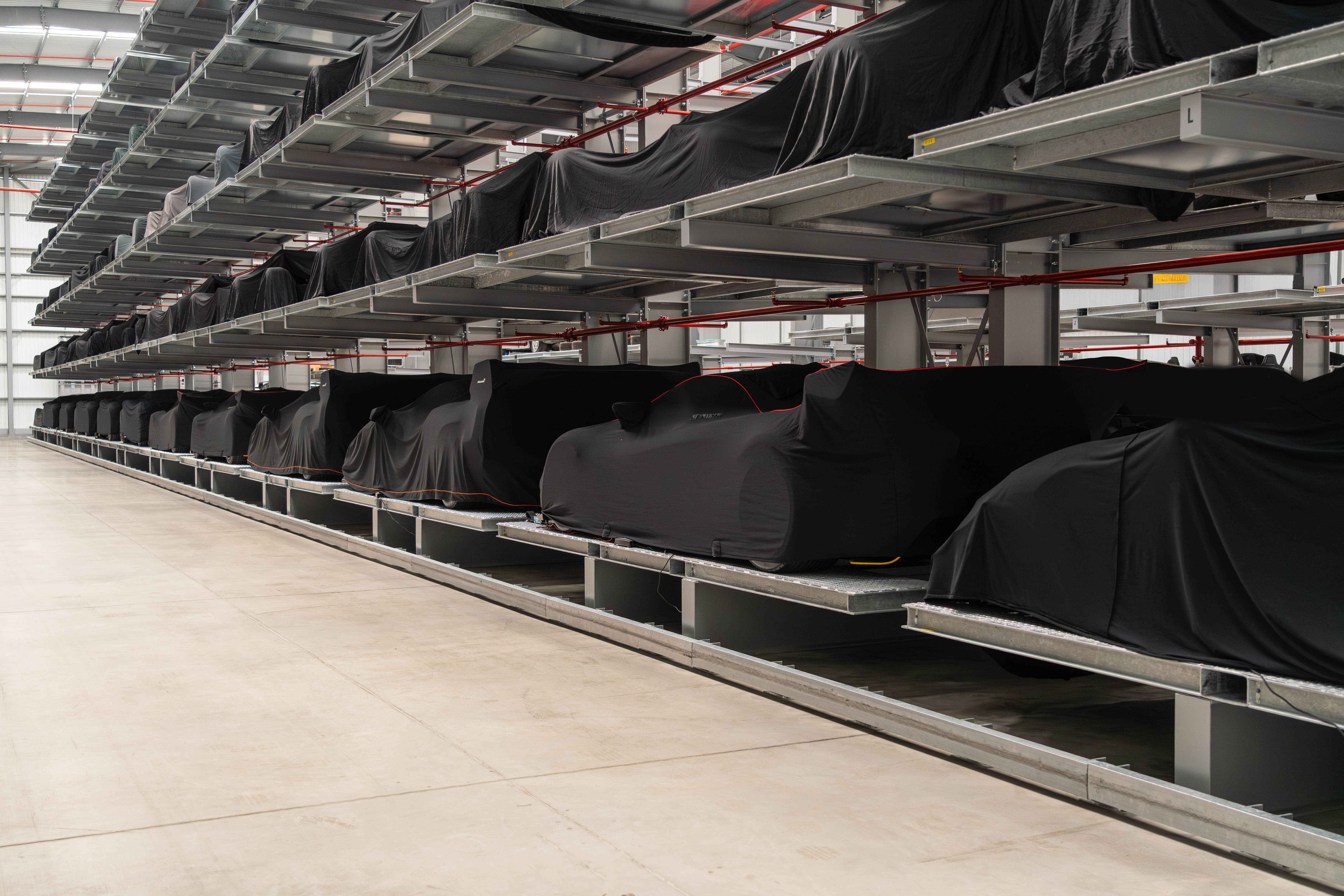 Once it’s ready to be stored, the vehicle is safely secured on its designated rack using a bespoke forklift that was custom-built for SHY’s state-of-the-art facility.